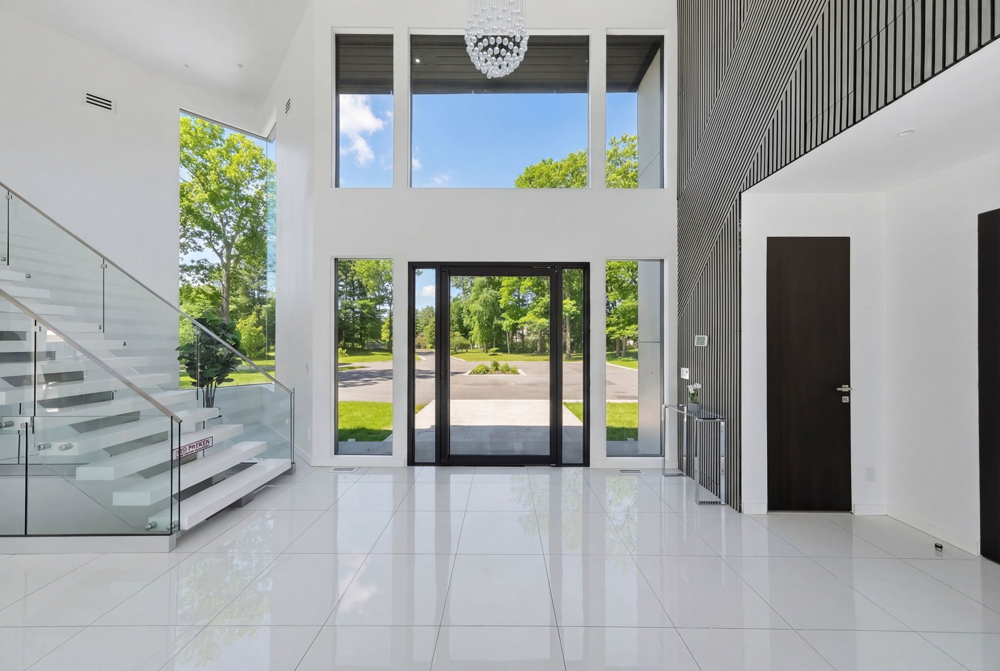Privately gated and newly renovated, this extraordinary 6-bedroom, 6 full bath, 4 half bath estate offers over 10,000 square feet of striking modern architecture set on lush, secluded grounds in Upper Brookville. A bold contemporary statement, the residence showcases a dramatic façade of crisp white panels framed in obsidian accents — a rare and sophisticated presence on the North Shore.